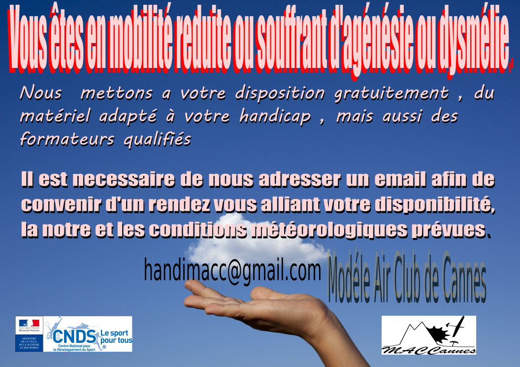 Apres s’être investi dans le F3F, nous avons parmi nos membres les champions du monde de cette spécialité, en Philippe LANES, Sébastien LANES, Matthieu MERVELET et Allan COHEN. Le club s’investit dans l’insertion des personnes à mobilité réduite dans notre passion. Nous mettons donc à la disposition de ces personnes notre matériel adapté , formateurs et temps …